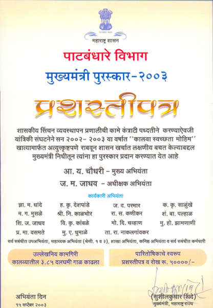 The excellent Canal Cleaning works rendered by Mechanical Organisation has resulted in significant cost reduction in Project Expenditure. For this Mechanical Organisation has received the Award in the form of cash of Rs 50,000 from Chief Minister Fund on 15th September